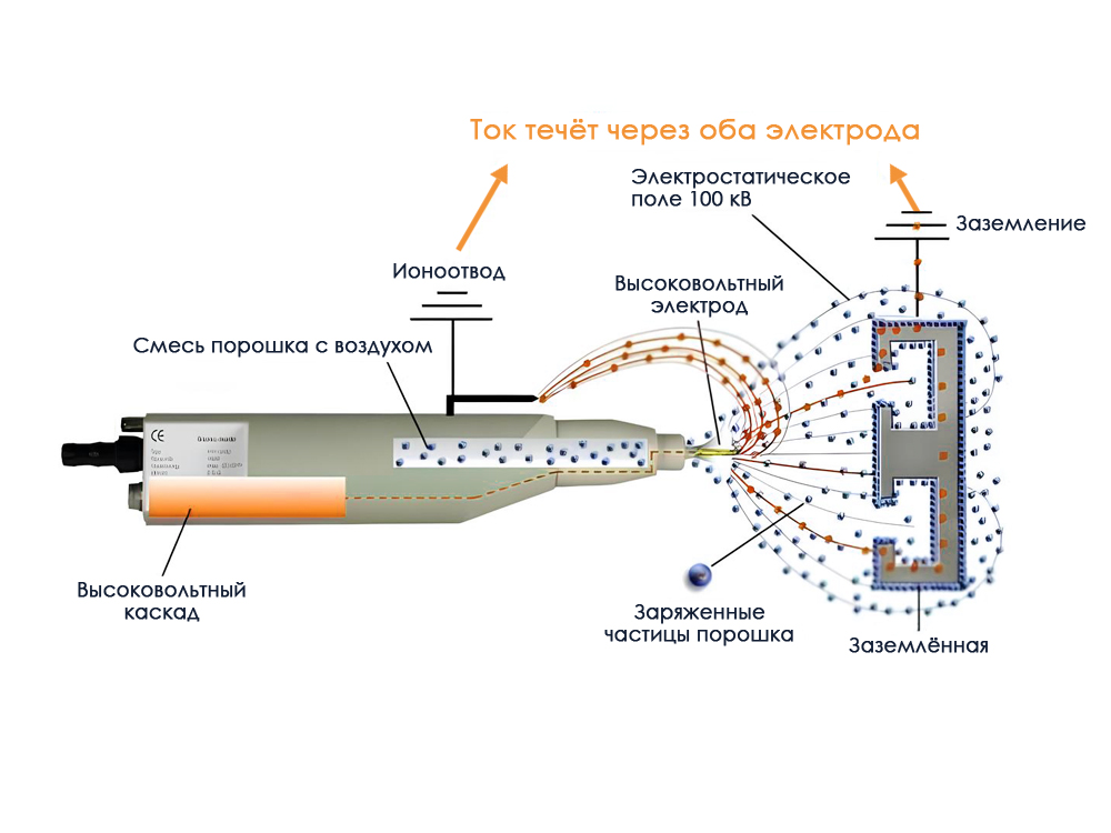 2. Покрытие изделия порошковой краской. Данный процесс происходит с использованием принципа электростатического осаждения порошковой краски. Для этого напыляемые частицы порошковой краски электрически заряжаются, что способствует равномерному покрытию изделия, на который подается противоположный заряд электричества.